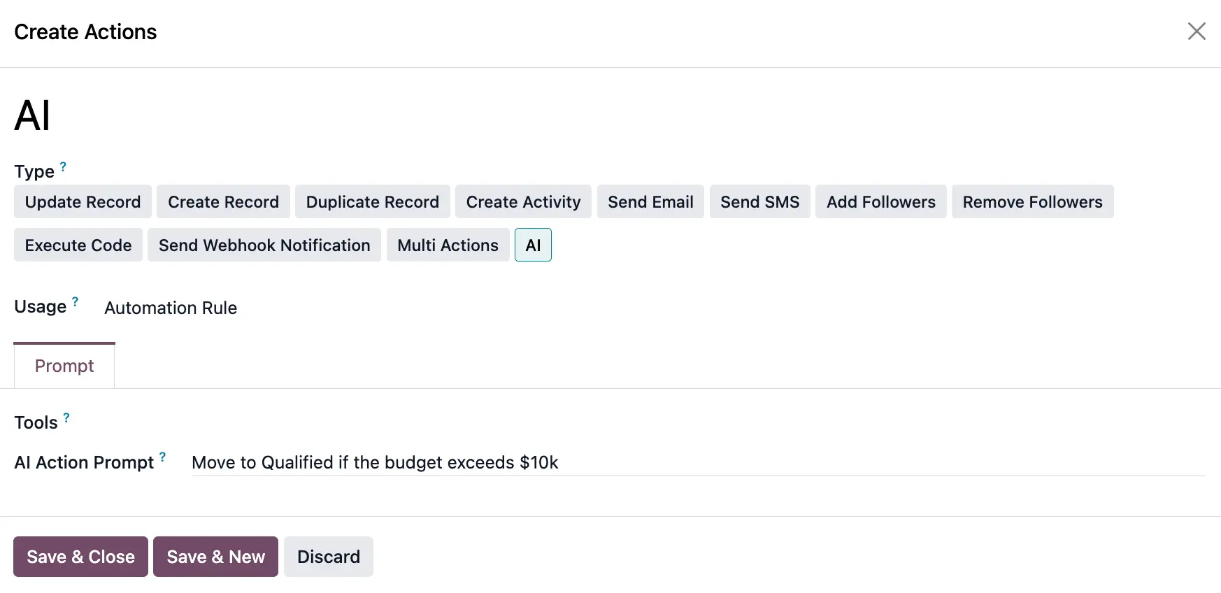 For example, an Odoo user can create automated actions to move tasks or qualify leads by simply describing the rule in free text, like "Move to Qualified if the budget exceeds $10k."