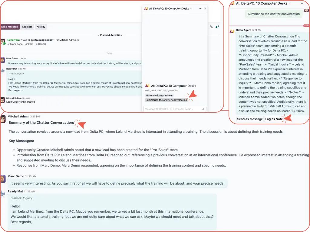 Odoo’s AI chatbot analyses all Chatter entries, emails, notes, and PDFs to generate a detailed summary.