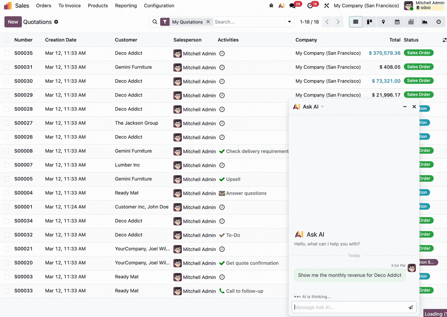 You can ask your AI chatbot, "Show me the monthly revenue for Customer A in 2025 vs 2026," and Odoo will instantly generate the filtered view you need - pivot, graph, etc.