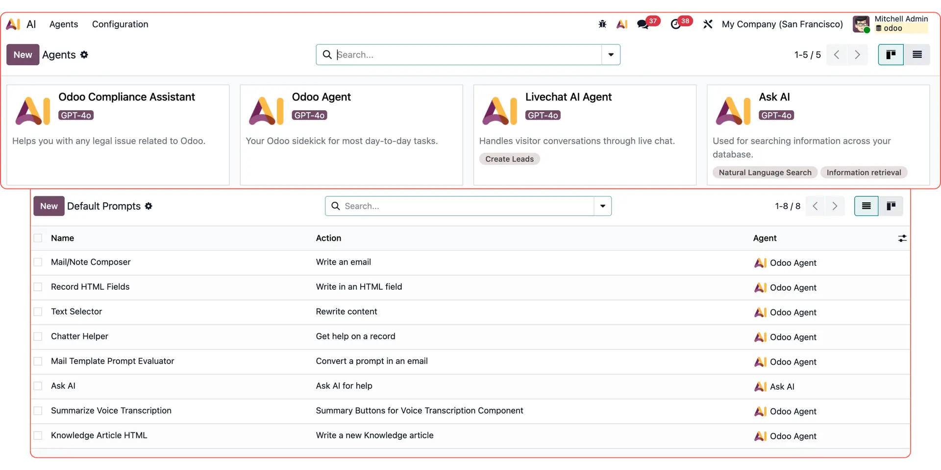 In version 19, Odoo introduced more autonomous AI with built-in agents like Ask AI, Odoo Agent, Compliance Assistant, and Livechat Agent. It also gave users the tools to build their own agentic AI workflows