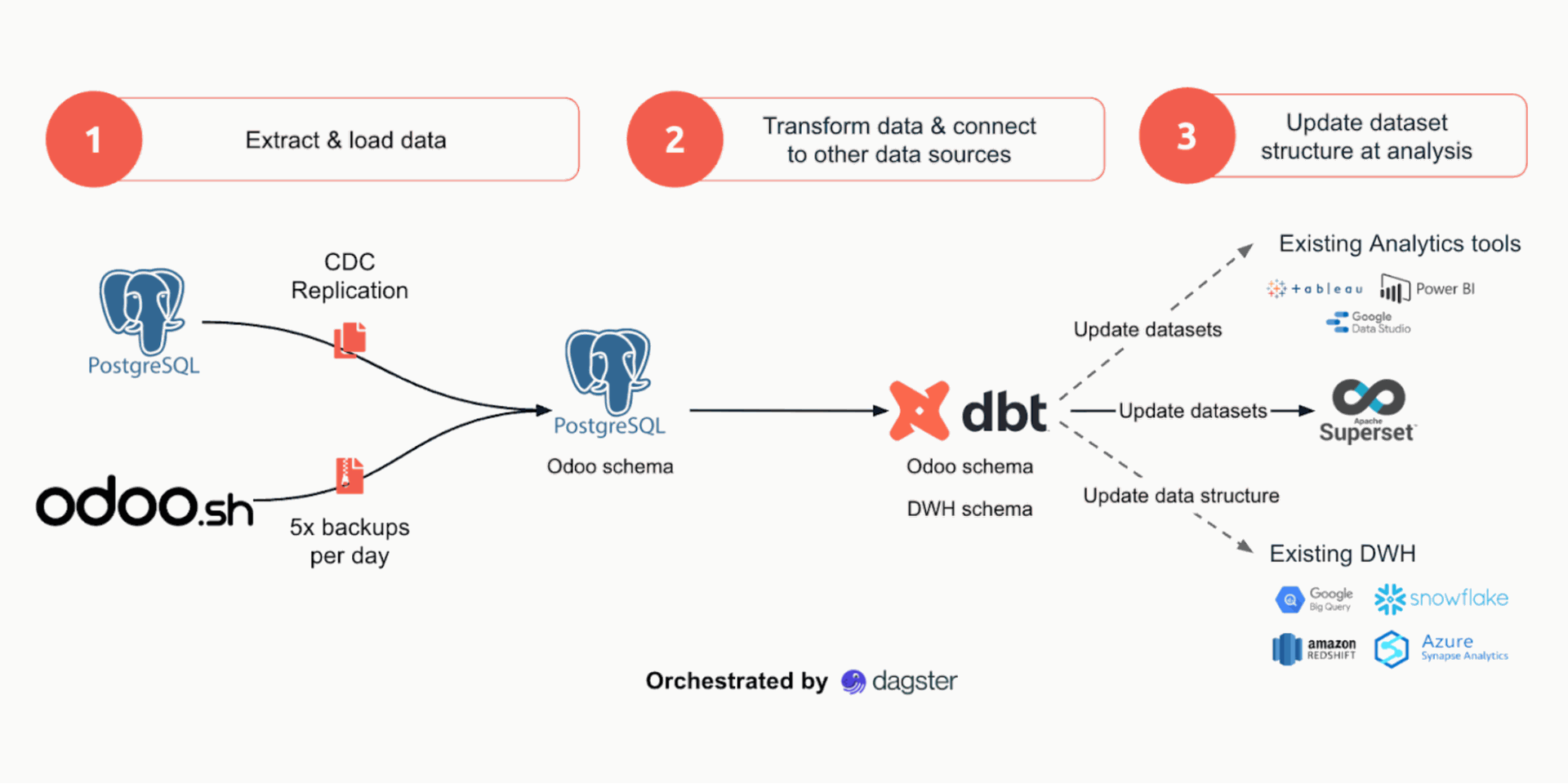 Our Odoo BI solution uses dbt and Dagster to replicate Odoo data and prepare it for analysis in the BI tool of your choice.