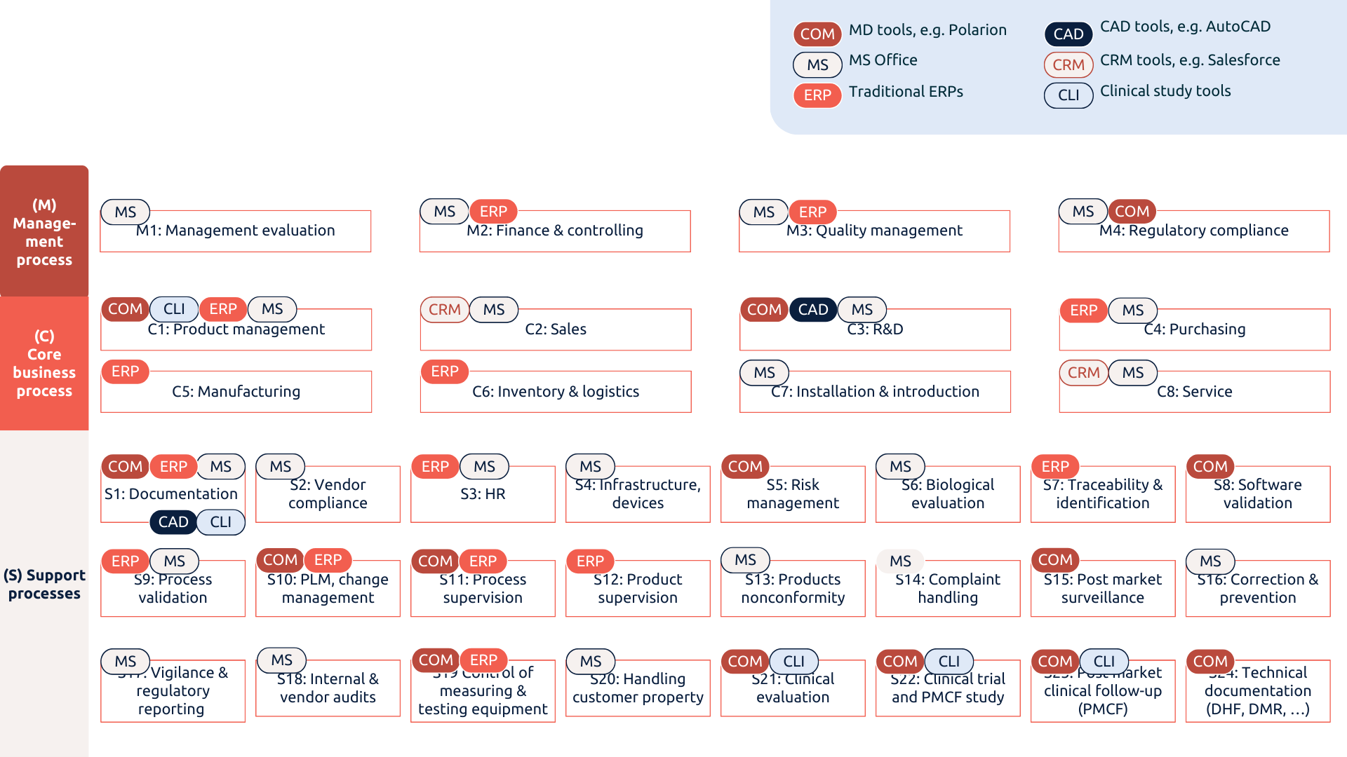Some MedTech processes still require external systems: for example, CAD design, clinical study tools, and specialist risk evaluation.