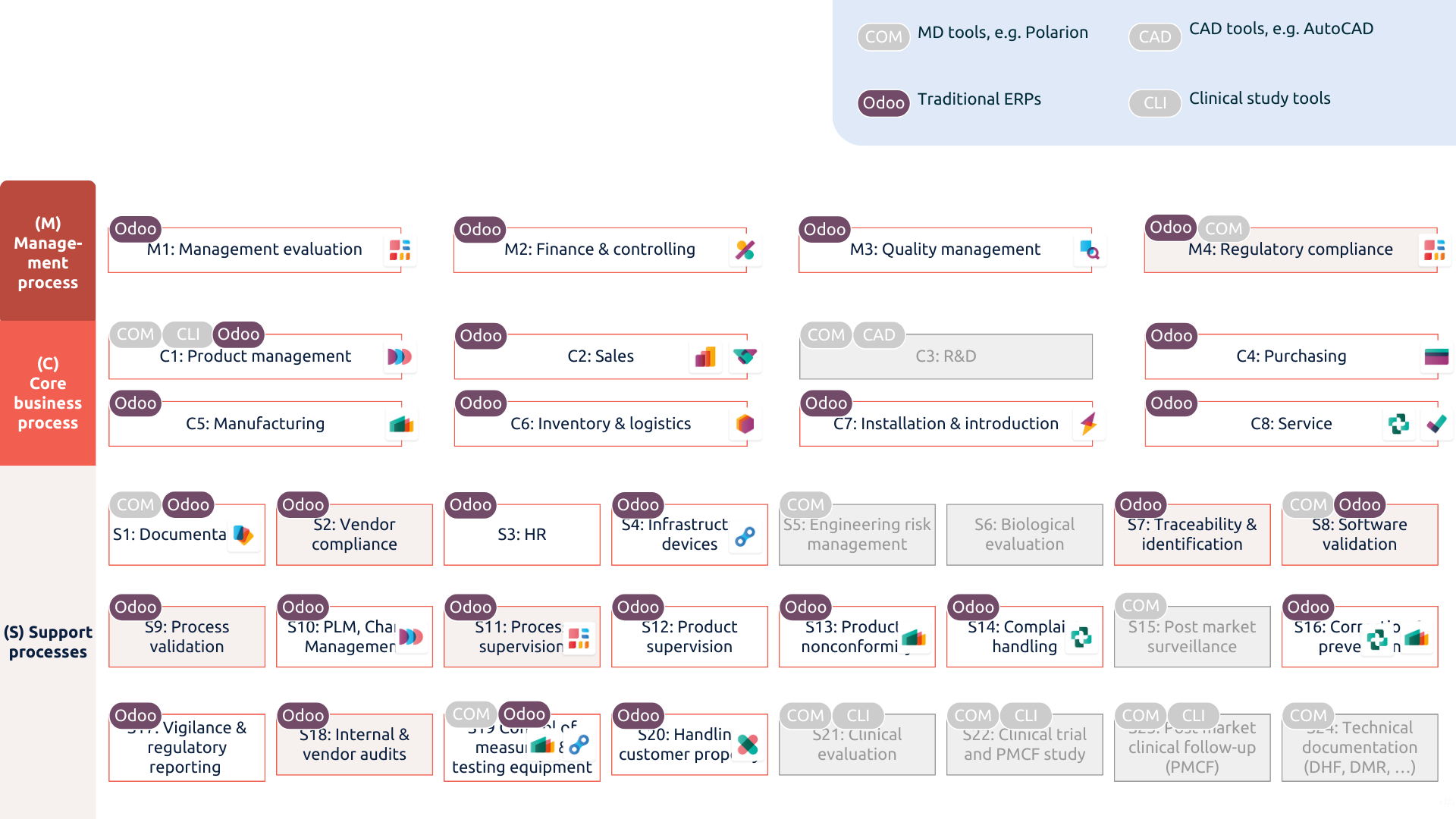 Out of the 36 key processes identified in MedTech, Odoo covers more than 30 out of the box, including: