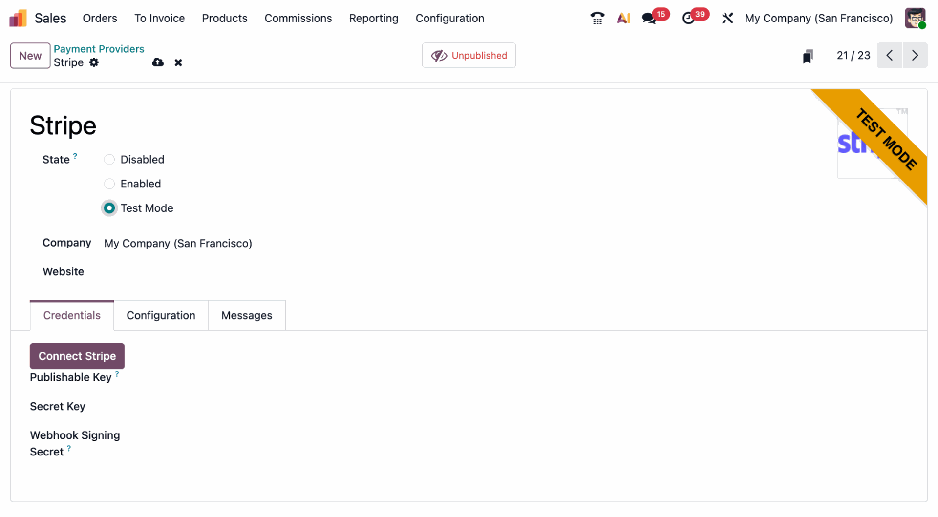 Setting up Stripe as a payment provider in Test mode in Odoo 19.
