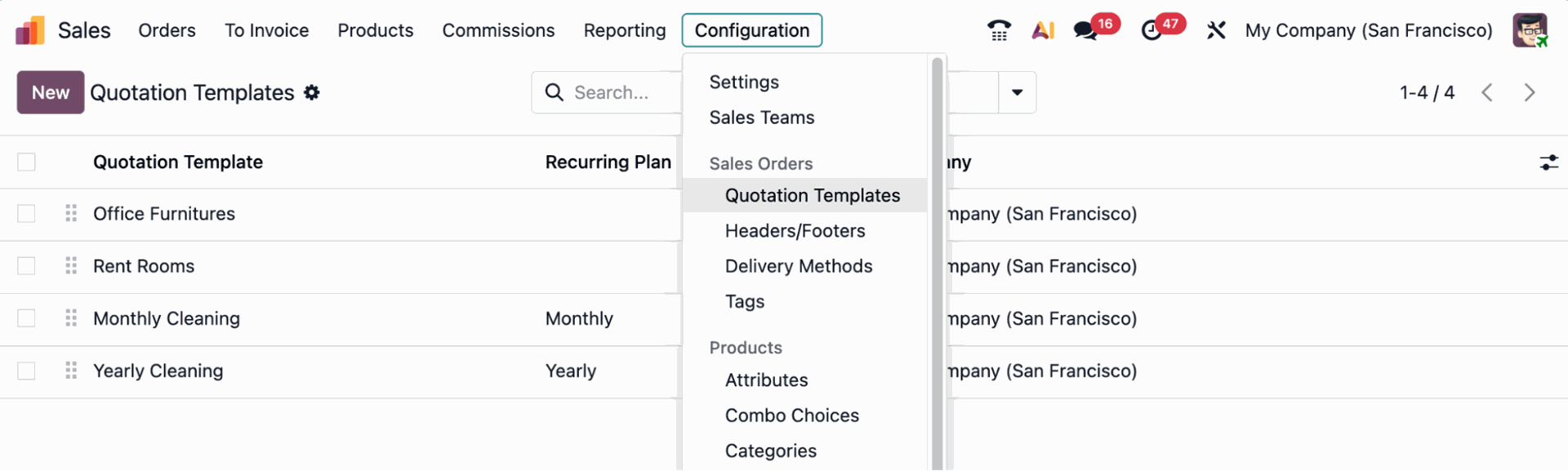 To set up a quote calculator in Odoo, start by creating a quotation template. Go to Sales → Configuration → Quotation Templates.