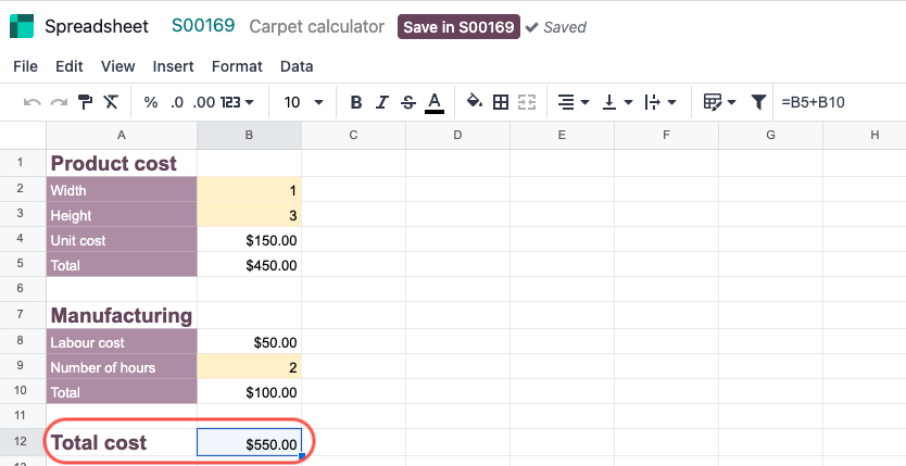 In our example, by changing the carpet size and the number of manufacturing hours, the total cost is automatically updated based on the setup we made beforehand.