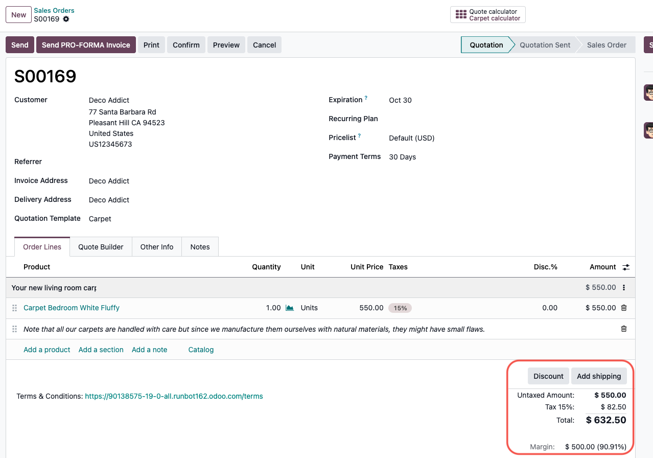 Odoo optimises this cost calculation process with its integrated quote calculator, which updates each quote automatically