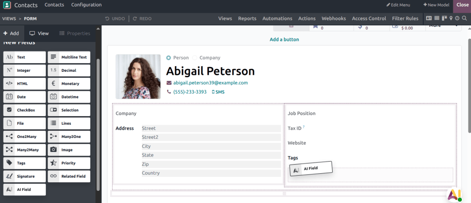 • Creating AI fields for unstructured data: Odoo Studio lets you build fields with AI prompts that handle unstructured data and adapt to new rules in seconds.