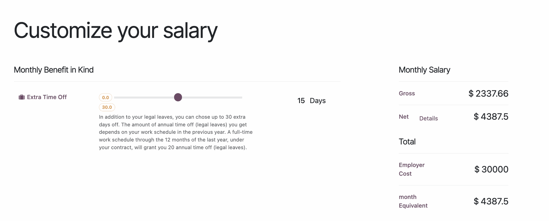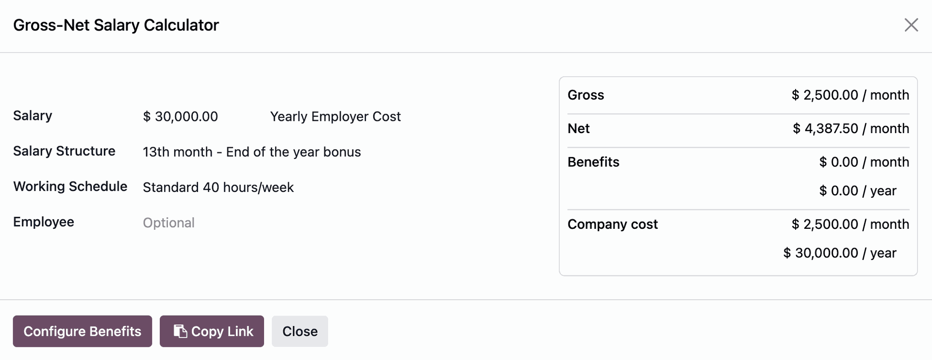Odoo’s new Salary Estimation Simulator lets you see both an employee’s net pay and the total cost to the company.