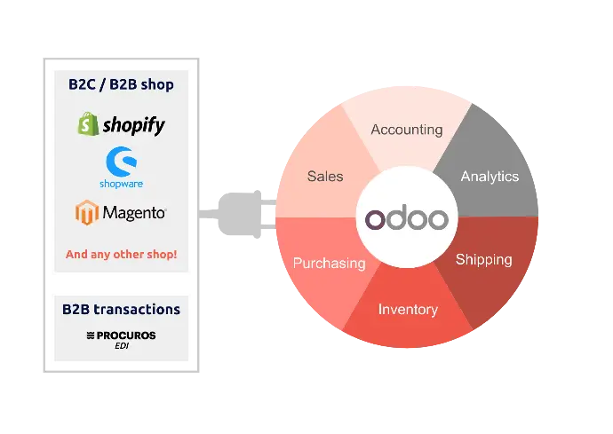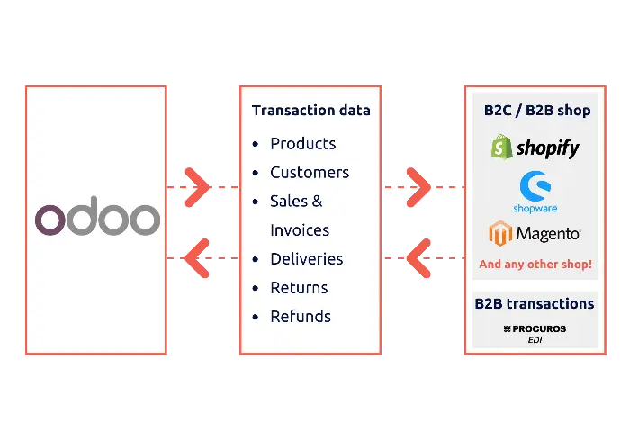 We offer integration solutions between Odoo and Shopify, Magento 2, WooCommerce, Shopware 6, and any other website builders. We also connect your B2B transactions to Odoo via EDI. This enables you to get seamless data synchronisation between e-commerce channels and business operations.