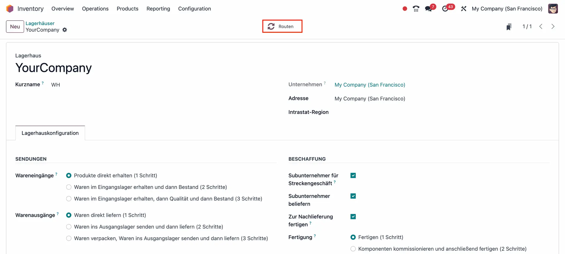 - Return to the Inventory app and navigate to Configuration > Warehouses