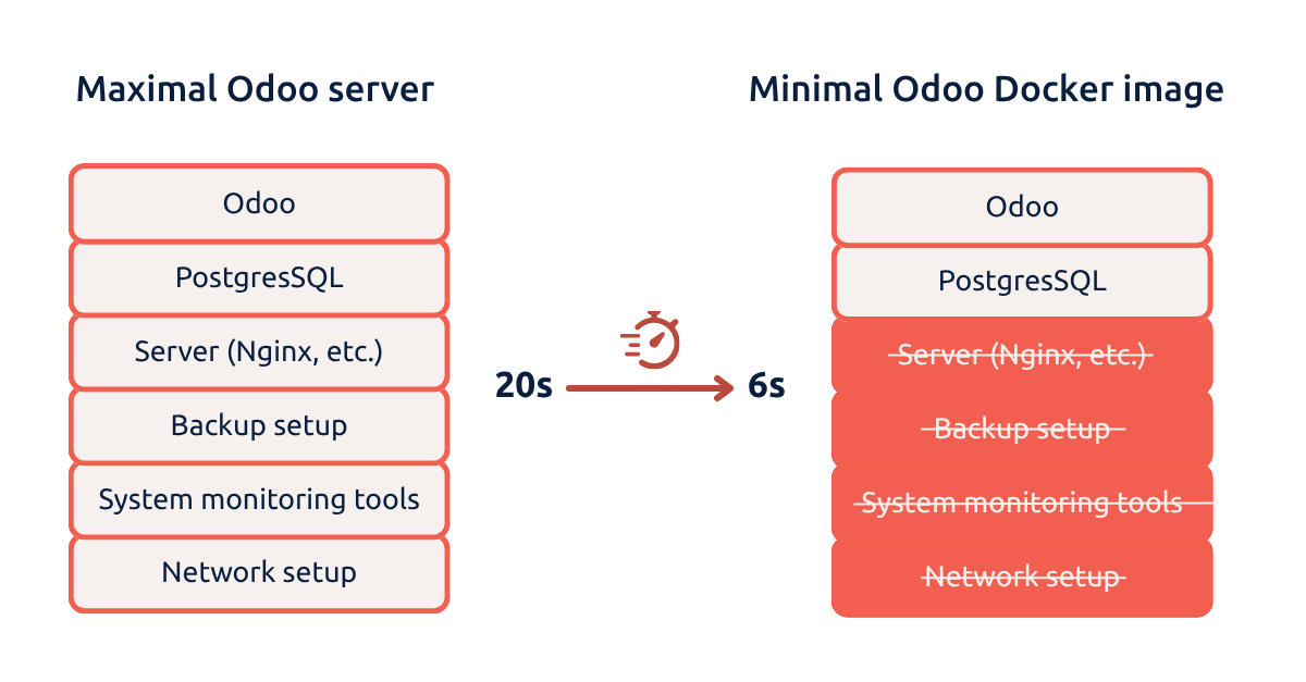 Maximal Odoo deployment (standard) | Minimal Odoo Docker image (optimised) | |