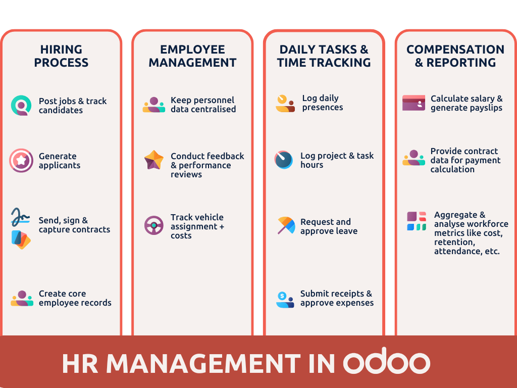 The Odoo HR suite is a complete people management system built entirely on a single, unified ERP.