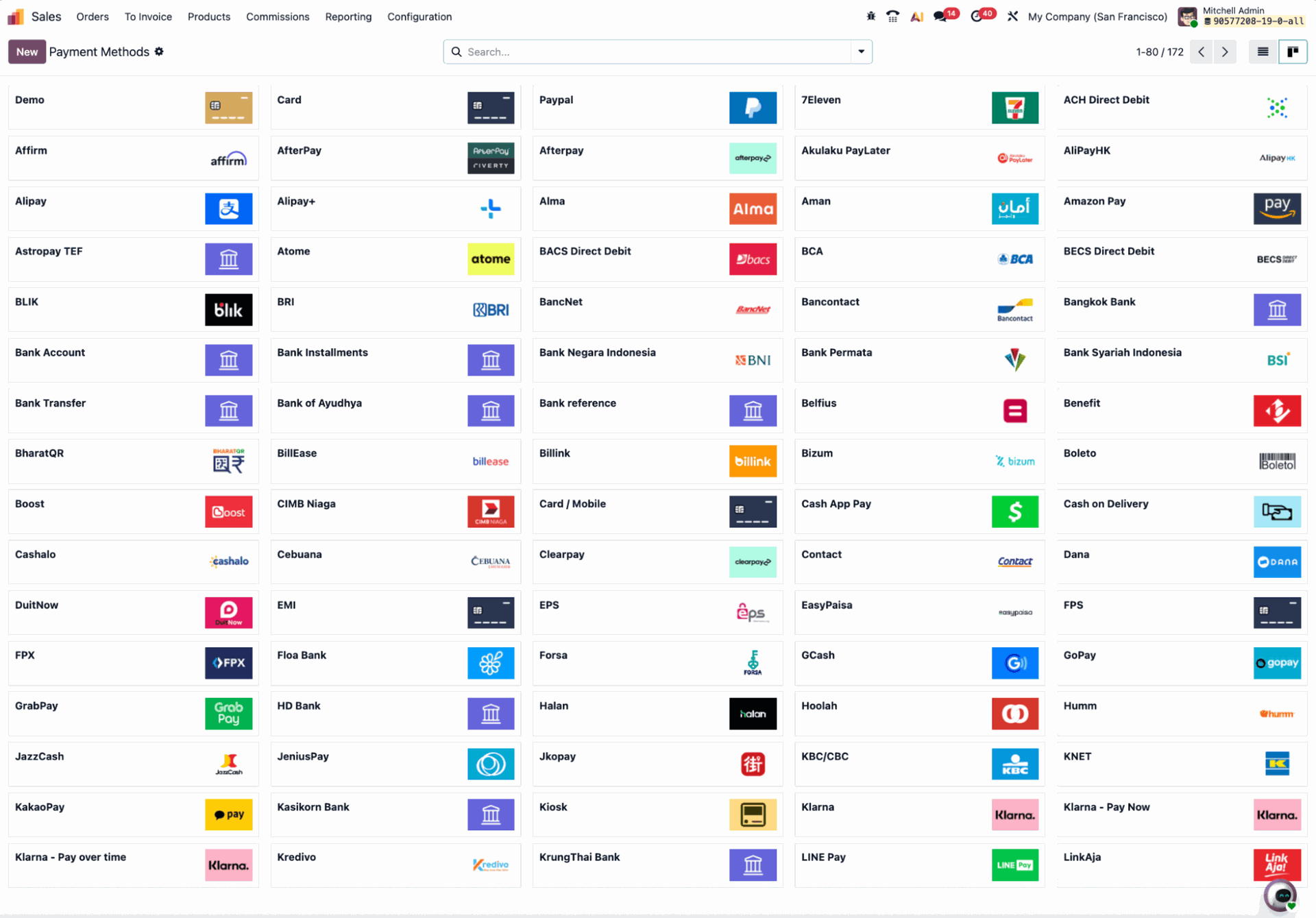 Odoo supports a wide range of payment methods, depending on the app and configuration you may need:
