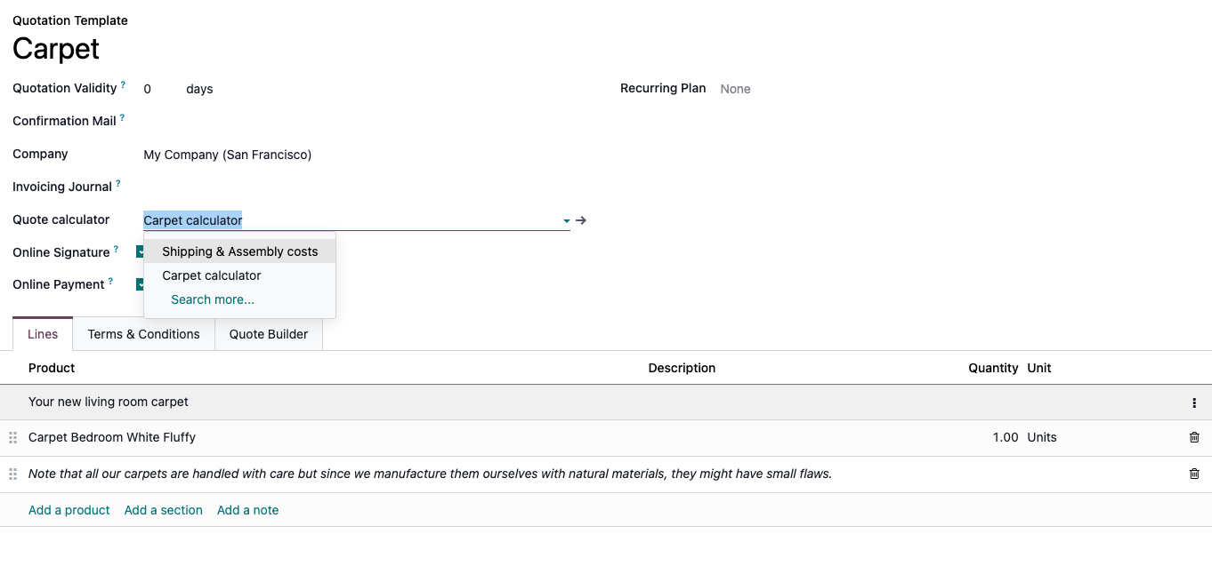 To set up a quote calculator in Odoo, start by creating a quotation template. Go to Sales → Configuration → Quotation Templates.