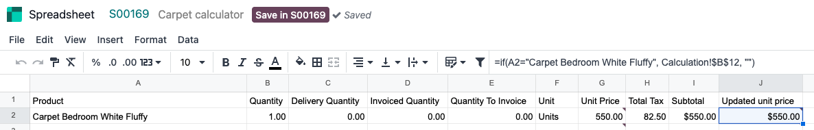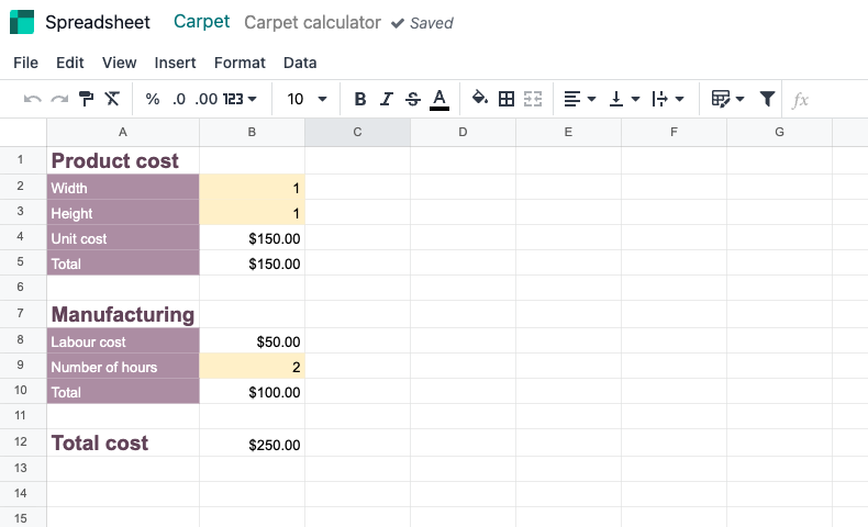 In our example, by changing the carpet size and the number of manufacturing hours, the total cost is automatically updated based on the setup we made beforehand.