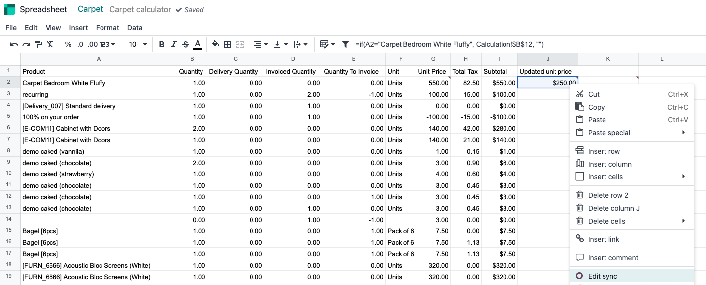 You can then sync your new Updated unit price field with the Sales Order line in the quotation. To do this, right-click on the Updated unit price cell and click on Edit Sync.