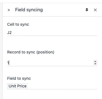 Make sure that the Record to sync position corresponds to the Sales Order line number in the quotation, and that the Field to Sync is correctly selected as Unit Price. The field Cell to sync does not need to be updated, since it has been populated with the current selected cell automatically.
