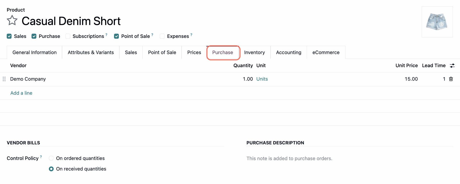 - Purchase tab: Add your supplier and the price you pay them. Odoo needs this to know who to send the order to.