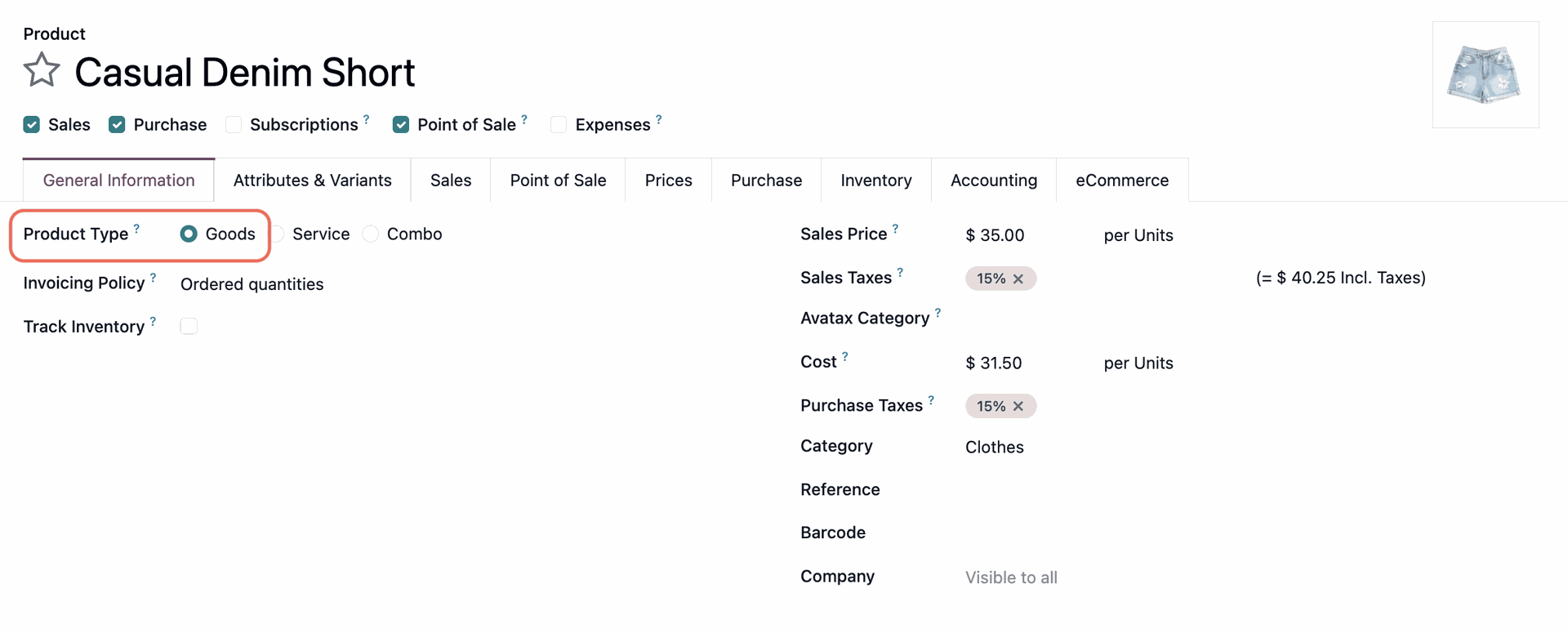- On the product form, ensure the Product Type is set to Goods.