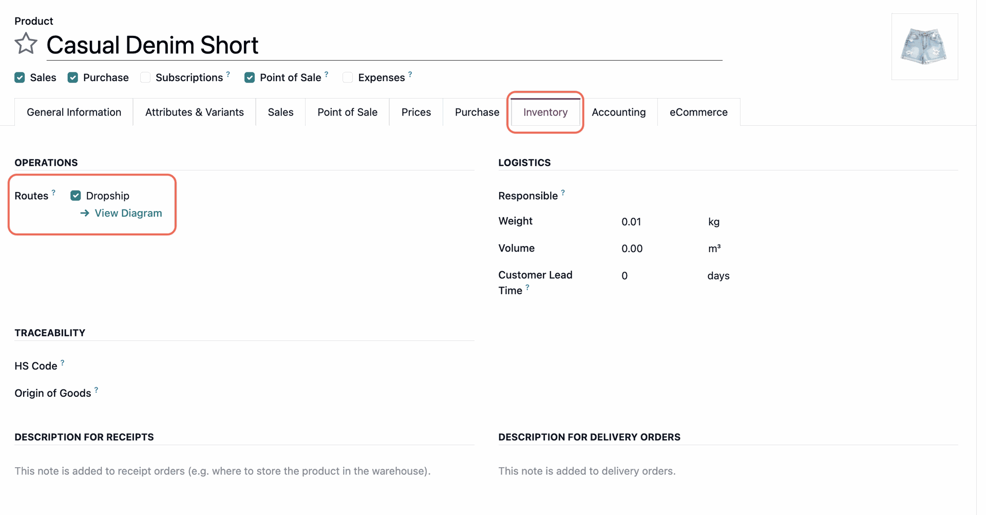 - Inventory tab: Under the Routes section, select Dropship.