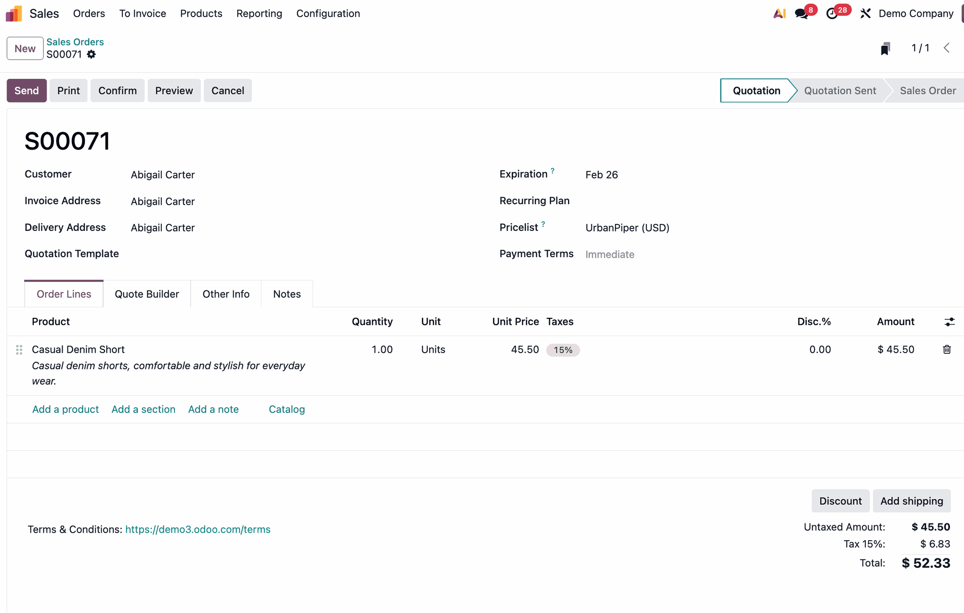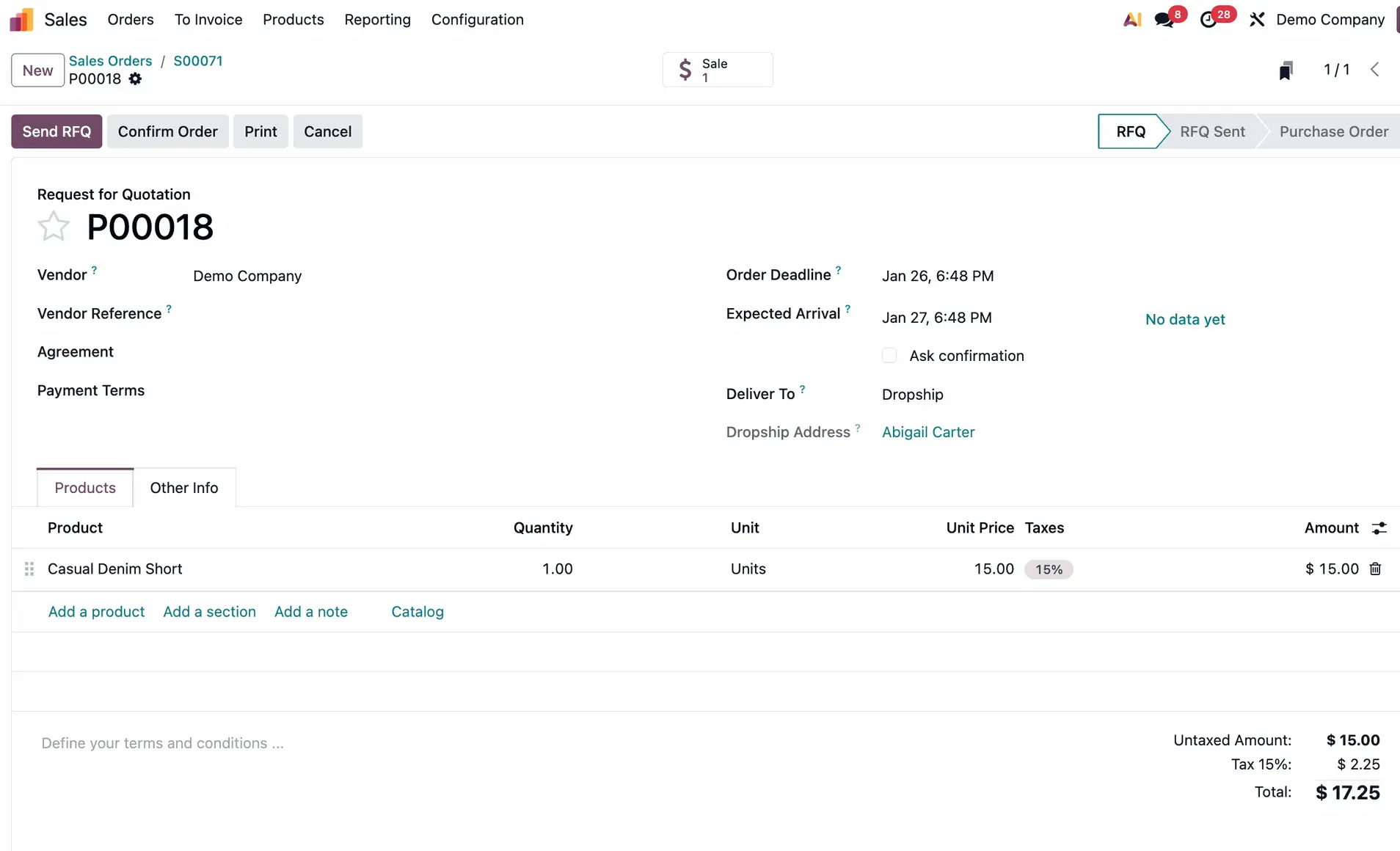 - Create Sales Order: Create a Sales Order for your customer. Once you confirm the SO, Odoo 19 instantly generates a linked Request for Quotation (RFQ).