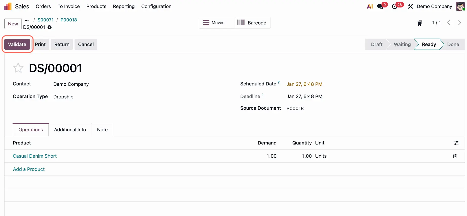 - Finish: When the vendor confirms they shipped the items, click Validate on the Dropship record. This tells Odoo the customer has received the goods.