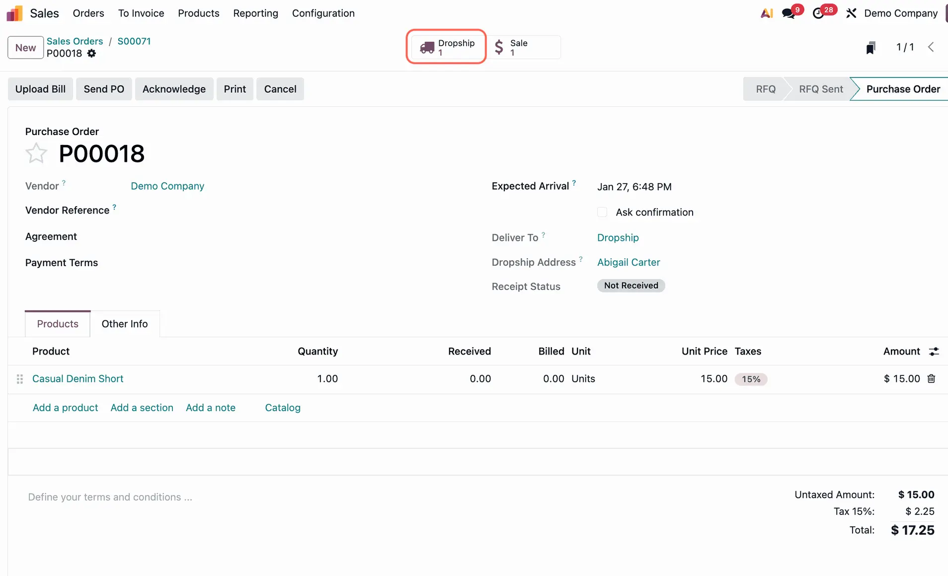 - Validate delivery: A "Dropship" smart button will appear on both the SO and the PO. Click it to see the delivery record.