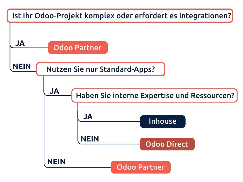 „Sollen wir Odoo selbst implementieren (DIY), die Dienste von Odoo direkt nutzen oder mit einem offiziellen Odoo-Partner zusammenarbeiten?“